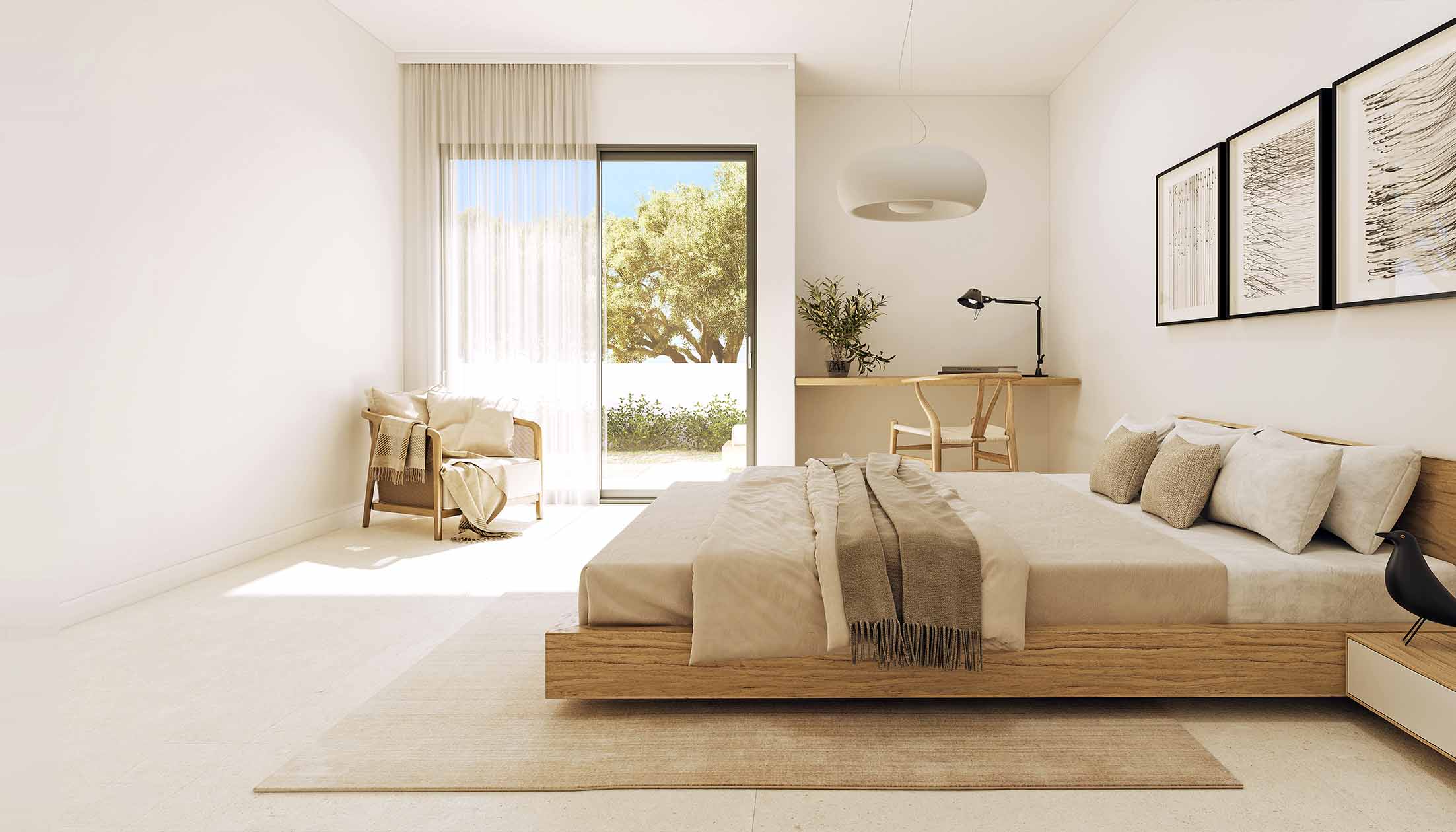 The 21 villas are divided into three almost identical villa types with constructed areas between approx. 350 m2 and 420 m2. They all have 3 to 4 bedrooms, 3 bathrooms, a living room, a kitchen and a TV room which can be used as office and a storage room. Furthermore, each villa is surrounded by lush Mediterranean gardens and offers its own pool.